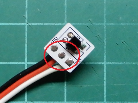 G下面に余裕が無い場合、赤丸部のセンサケーブル半田付け部分を平らにヤスリで削ると収まりが良くなります。 |