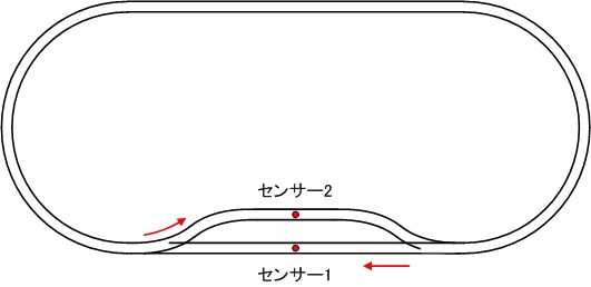 直線レール上を、センサーの間で往復運転します。 動作モード1 直線レール以外にも以下の様なレイアウトでも往復運転は出来ます。