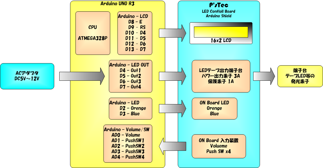 | MPUボードにはArduino UNOを使用していますので、C言語初心者でも比較的簡単に点灯パターン等作成することが出来ます。 |