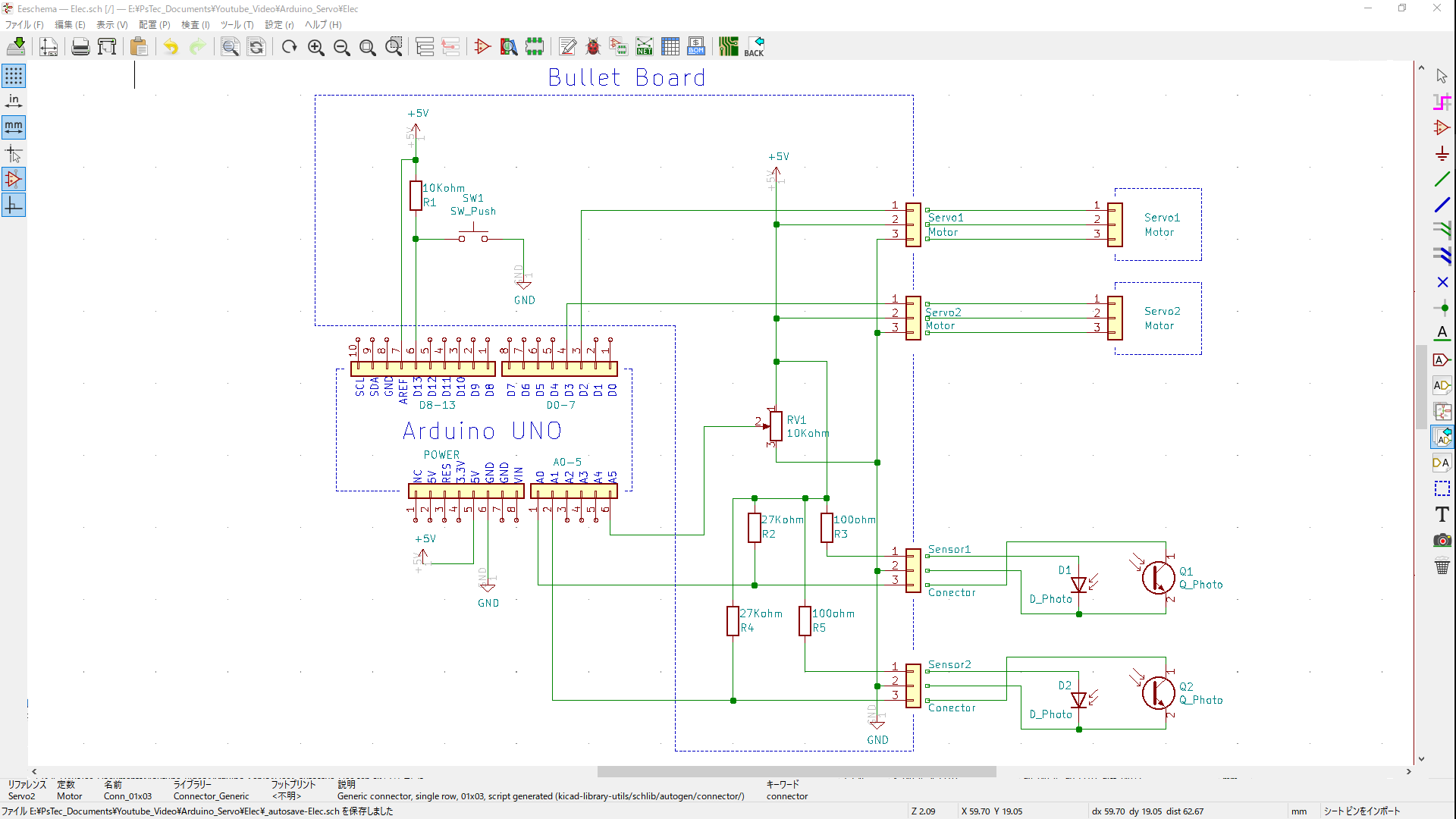 ArduinoUNOの汎用シールドキバンを使って、コネクタまでの配線を作りました。 Arduino UNO互換機でもOKです。 入力はボリュームとプッシュスイッチです。 センサは透過回路用に組んでいます。 |