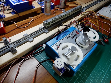 線路両端に赤外センサを配置し、センサが検出すると、サーボモータでPowerPackを減速停止させます。 一定時間経過後にもう一つのサーボモータを反転動作させます。 さらにサーボモータを動かし目標速度まで動作させます。